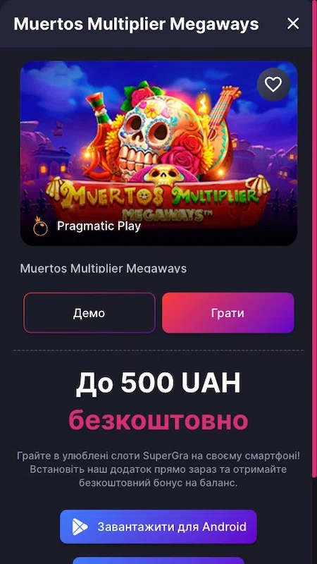 Я вважаю, що гра на мобільних пристроях краща, ніж на ПК через її доступність та зручність. Гемблер може знаходитись будь-де та у вільну хвилину отримає доступ до слота за пару клаців. Графіка, звук та анімаційні ефекти Muertos Multiplier Megaways такі ж самі якісні, тому жодної різниці від десктопної версії не відчувається.