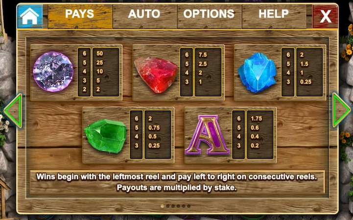 | Символы | 9 | 10, J | Q | K, A | Зеленый камень | Синий камень | Красный камень | Фиолетовый камень |